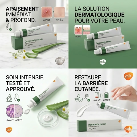 La Dermovate Crème est un dermocorticoïde de classe IV (très puissant), conçu pour soulager rapidement les affections cutanées inflammatoires sévères. Elle est particulièrement efficace pour réduire les rougeurs, les démangeaisons et les gonflements liés aux pathologies rebelles.